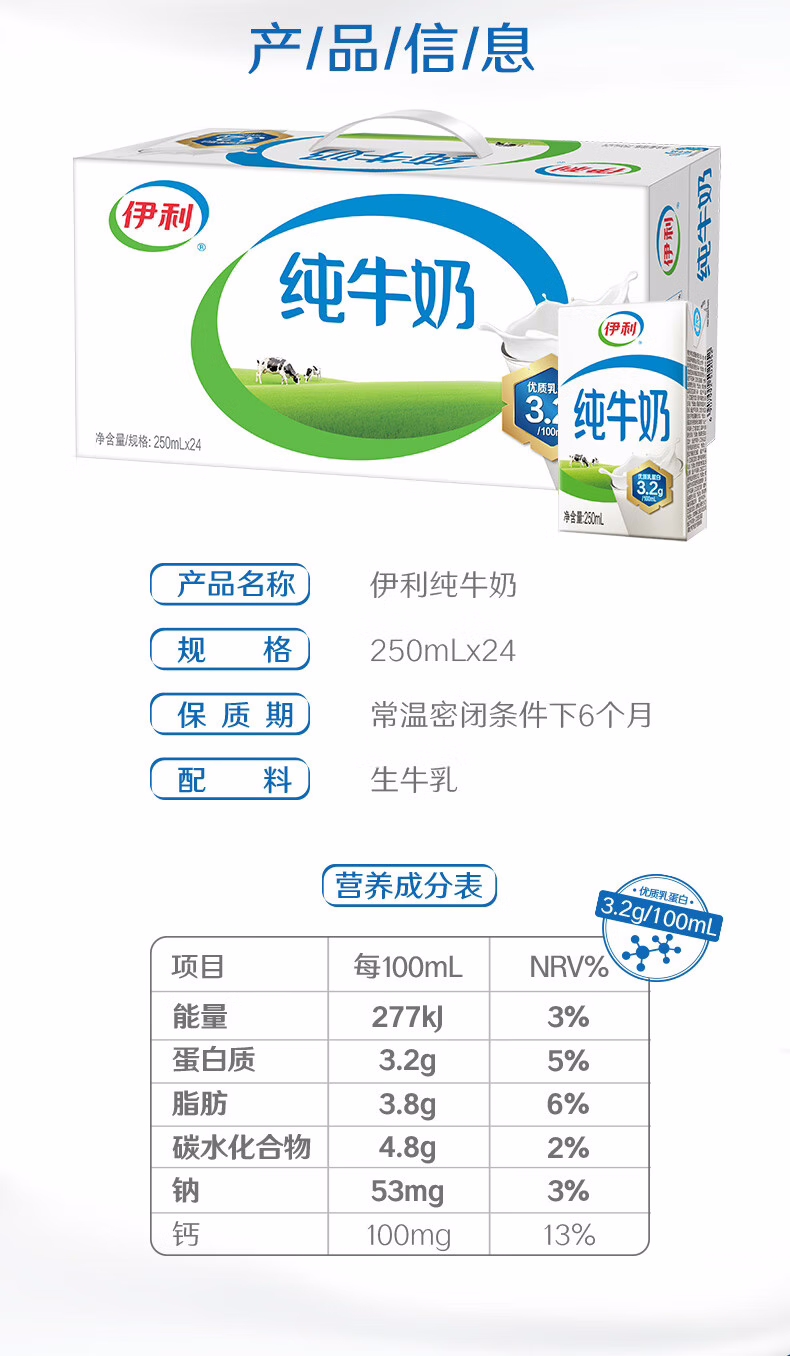只要39.9元 【特价9月产】伊利纯牛奶250ml*24盒 【箱子可到店兑换8元]